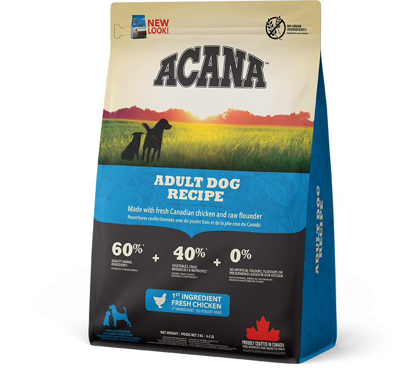 Your dog is descended from the grey wolf and requires the same protein-rich diet in order to support peak health. Featuring chicken, wild-caught flounder, and eggs that are delivered to our kitchen fresh or raw*, ACANA™ Adult Dog is packed with the protein and nutrients your dog needs. ACANA™ delivers nutrients naturally, in their most nourishing form, keeping your dog happy, healthy, and strong.