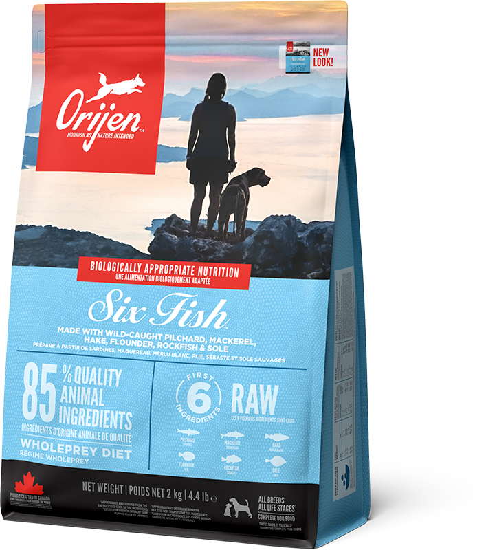 Help your dog thrive with the power of protein-rich recipes that provide peak nourishment. Dogs are ancestral carnivores, so they need a Biologically Appropriate™ diet rich and varied in whole animal ingredients. ORIJEN™ Six Fish™ diet is made with a variety of succulent fish including raw1 pilchard, mackerel, hake, flounder, rockfish and sole. Packed with WholePrey animal ingredients like organs and bone, ORIJEN™ food is made with the nutrient-dense, succulent parts of the prey to deliver the nutrition dogs need. With 85%2 quality fish ingredients and a freeze-dried liver coating, this diet is beyond comparison.
