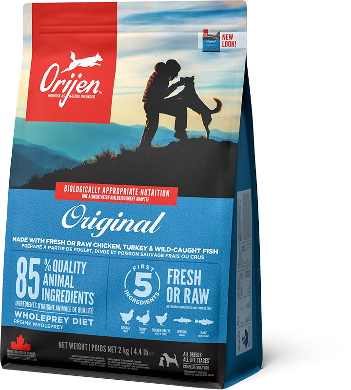 Help your dog thrive with the power of protein-rich recipes that provide peak nourishment. Dogs are ancestral carnivores, so they need a Biologically Appropriate™ diet rich and varied in whole animal ingredients. ORIJEN™ Original diet is packed with 85%* quality animal ingredients like fresh or raw chicken and turkey, and wild-caught or sustainably farmed fish. Packed with WholePrey animal ingredients like organs and bone, ORIJEN™ food is made with the nutrient-dense, succulent parts of the prey to deliver the nutrition dogs need. The result is a diet for your canine companion that is beyond comparison.