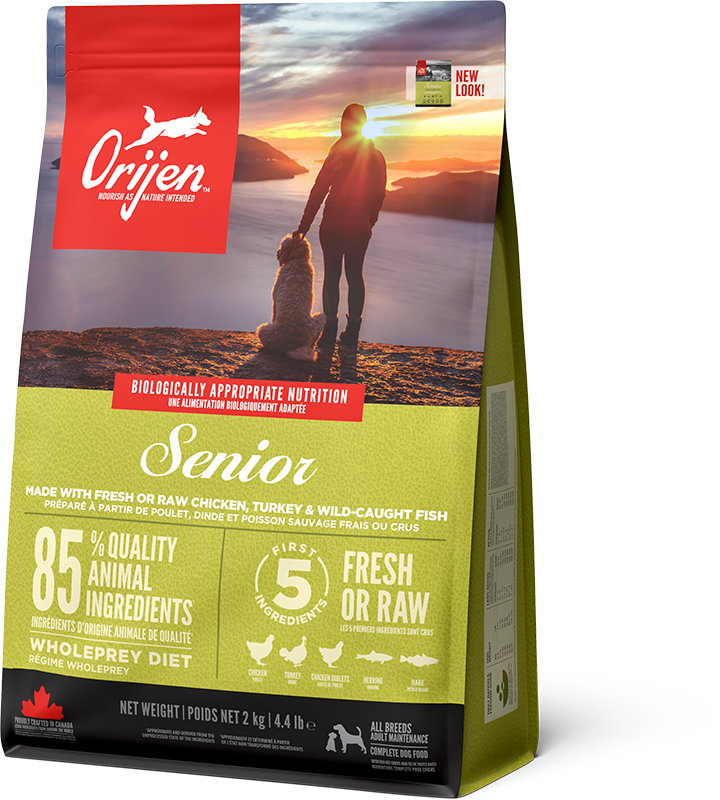 Help your dog thrive with the power of protein-rich recipes that provide peak nourishment. Dogs are ancestral carnivores, so they need a Biologically Appropriate™ diet rich and varied in whole animal ingredients. ORIJEN™ Senior diet is crafted specifically for your senior dog to help them stay healthy by supporting lean muscle mass and weight maintenance. Packed with WholePrey animal ingredients like organs and bone, ORIJEN™ food is made with the nutrient-dense, succulent parts of the prey to deliver the nutrition dogs need. With 85%1 quality animal ingredients and a freeze-dried liver coating, this diet is beyond comparison.